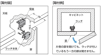 ● 両開き扉用のラッチです。片側の扉を開けた時、もう一方の扉も開いてしまうのを防ぎます。 ●天板、底板のどちらにも少ないスペースで取り付けできます。 ● 扉を開ける時は、レバーを指で倒します。ロックするときは、扉を閉めるだけでレバー操作は不要です。 ●インセット、アウトセットどちらのキャビネットにも使用できます。 【推奨ねじ】 ●十字穴付皿タッピンねじ3×16